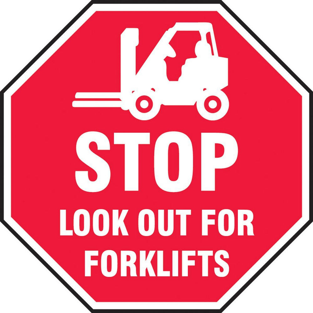 Adhesive Backed Floor Signs; Message Type: Traffic Control; Message/Graphic: Message & Graphic; Message or Graphic: Message & Graphic; Legend: STOP LOOK OUT FOR FORKLIFTS; Material: Vinyl; Legend Color: White; Color: Red, White; Shape: Octagon